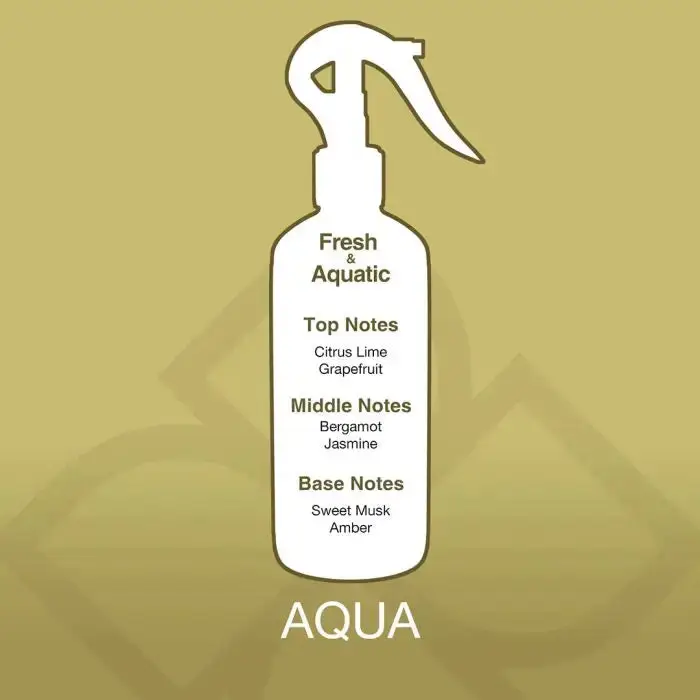 Perfect for living rooms, bedrooms, offices, and washrooms, Aqua Aroma Mist room spray offers a balanced scent profile with fresh citrus and aquatic notes that create a calm and uplifting environment. Its non-flammable, fabric-safe formula makes it suitable for daily use on curtains, sofas, linens, and other washable surfaces.