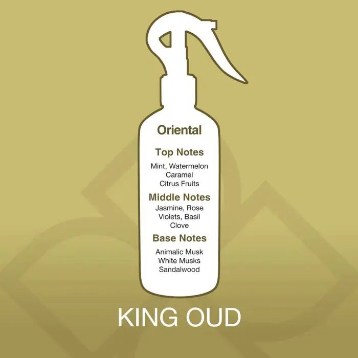 The non-flammable, residue-free formula makes King Oud Aroma Mist Room Spray safe for daily use and suitable for fabrics, linens, and curtains when used as directed. Just a few sprays are enough to refresh your environment and elevate your space with a bold oud character that lasts.