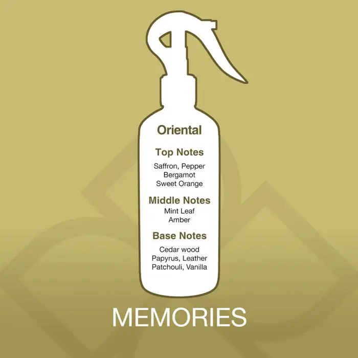 Memories Room Spray is a premium aroma mist designed to capture warmth, emotion, and timeless elegance. Blending refined saffron with fresh mint, smooth cedar, and soft vanilla notes, this fragrance creates a comforting and memorable atmosphere in any space.