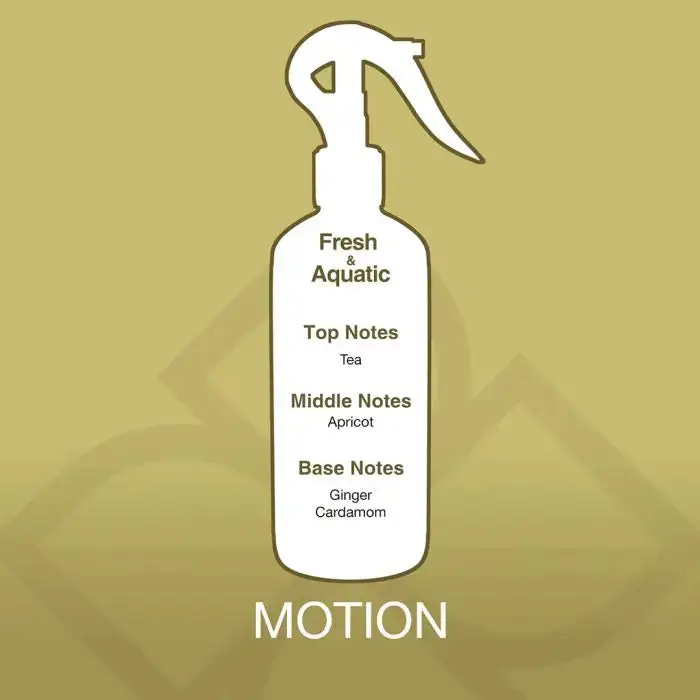 Motion Room Spray is a premium aroma mist designed to refresh your space with a clean, dynamic, and energizing fragrance. Blending crisp tea notes with a soft apricot heart, this scent creates a bright and uplifting atmosphere that feels modern and active.