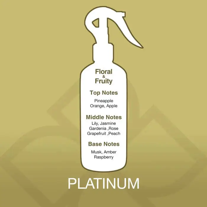 Crafted as a luxury room spray, Platinum works beautifully as a refined room freshener, refreshing living rooms, bedrooms, and offices with a crisp and long-lasting aroma. The fragrance feels light, modern, and perfectly balanced without being overpowering.