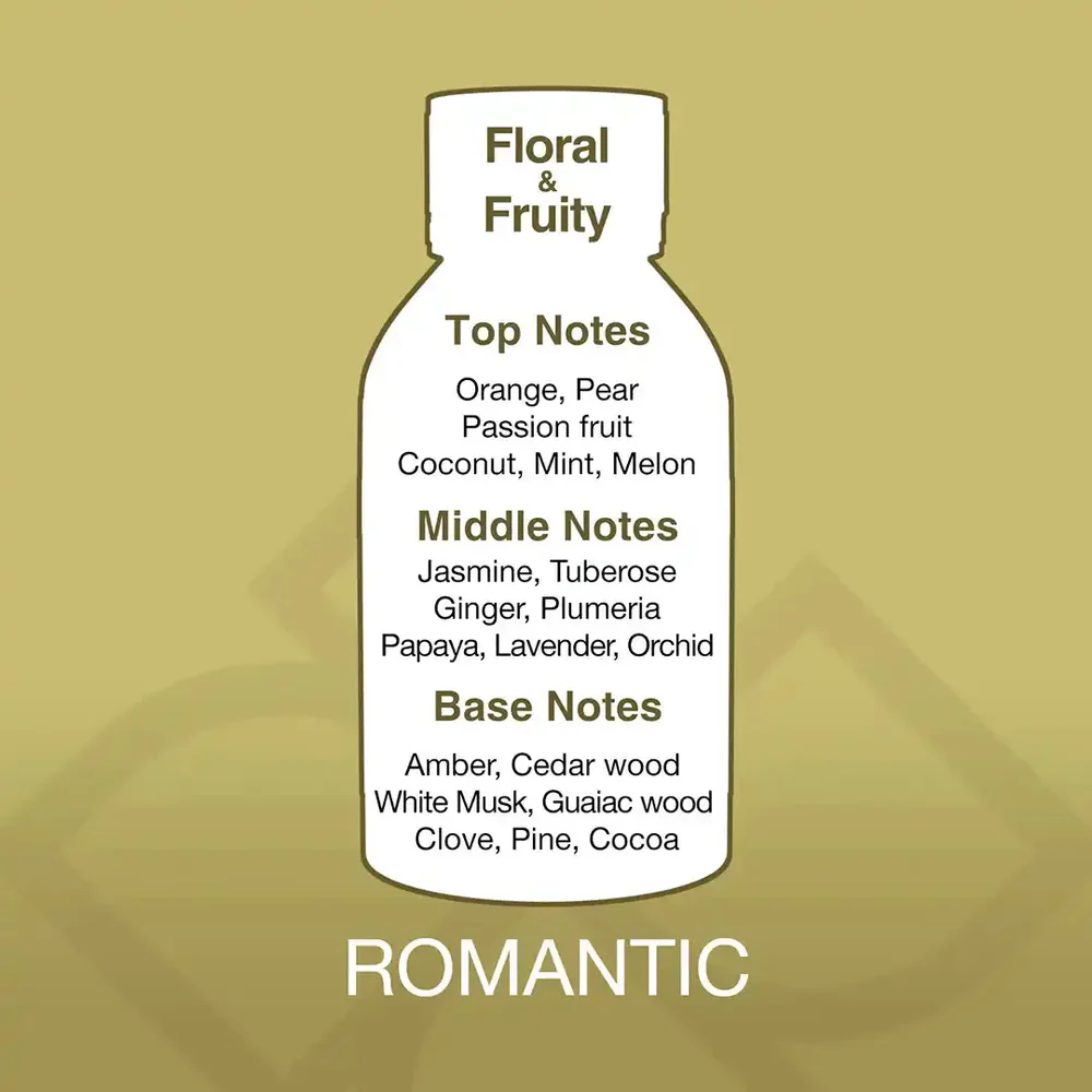 Notes: Amber, Cedar Wood, Clove, Coconut, Ginger, Guaiac wood, Jasmine, Lavender, Melon, Mint, Orange, Orchid, Passionfruit, Pear, Pine, Tuberose, White Musk
